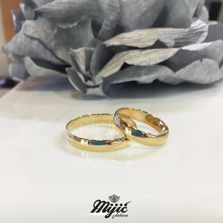Kombinacija žutog, belog ili roze zlata, širine 4mm. Klasična, poluobla burma sa visokim sjajem.