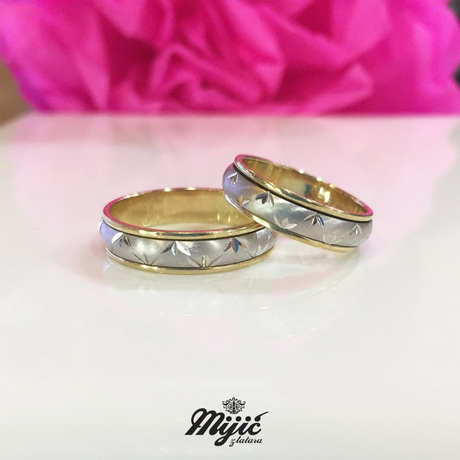 Kombinacija žutog, belog ili roze zlata, širine 5mm. Obogaćene nesvakidašnjom teksturom, diskretno satinirane.