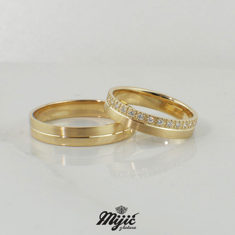 Model Capri u žutom zlatu, i muška i ženska u kombinaciji matiranih i poliranih površina. Na ženskoj cikroni do pola burme. Cena je za burme u paru.