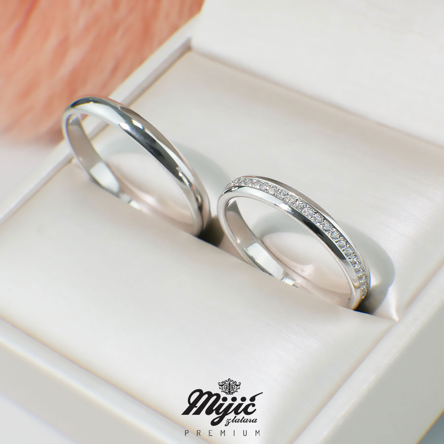 Klasičan poluobli dizajn, visoki sjaj i jedan red sitnih cirkona koji se prostiru do polovine burme.