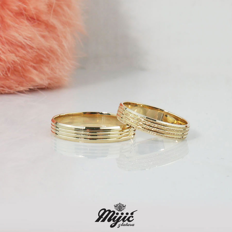 Ručno pikovan model, sa tri kanala i oborenim ivicama. Muška polirana, ženska sa dijamantskom prašinom. Cena je za burme u paru.