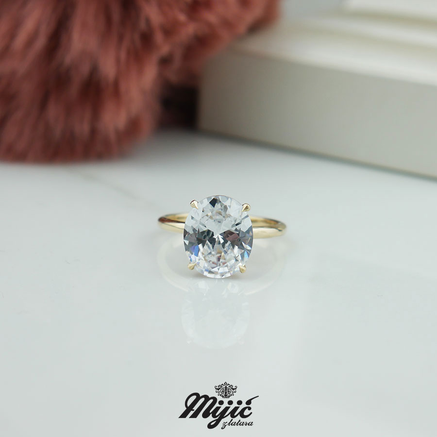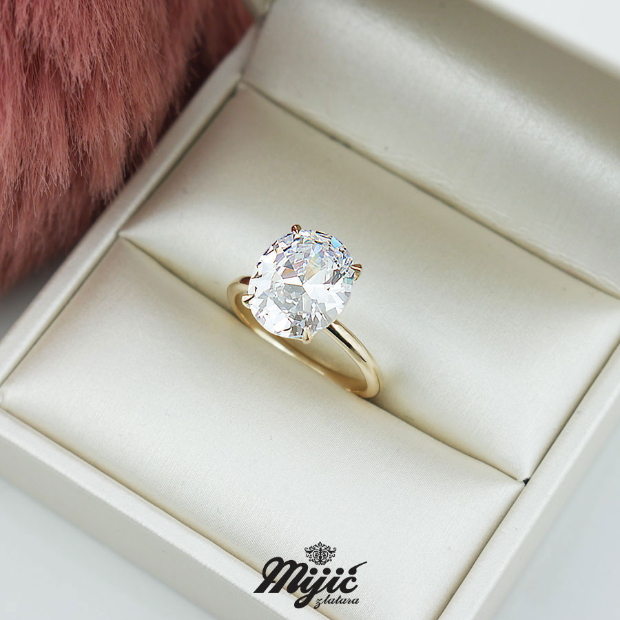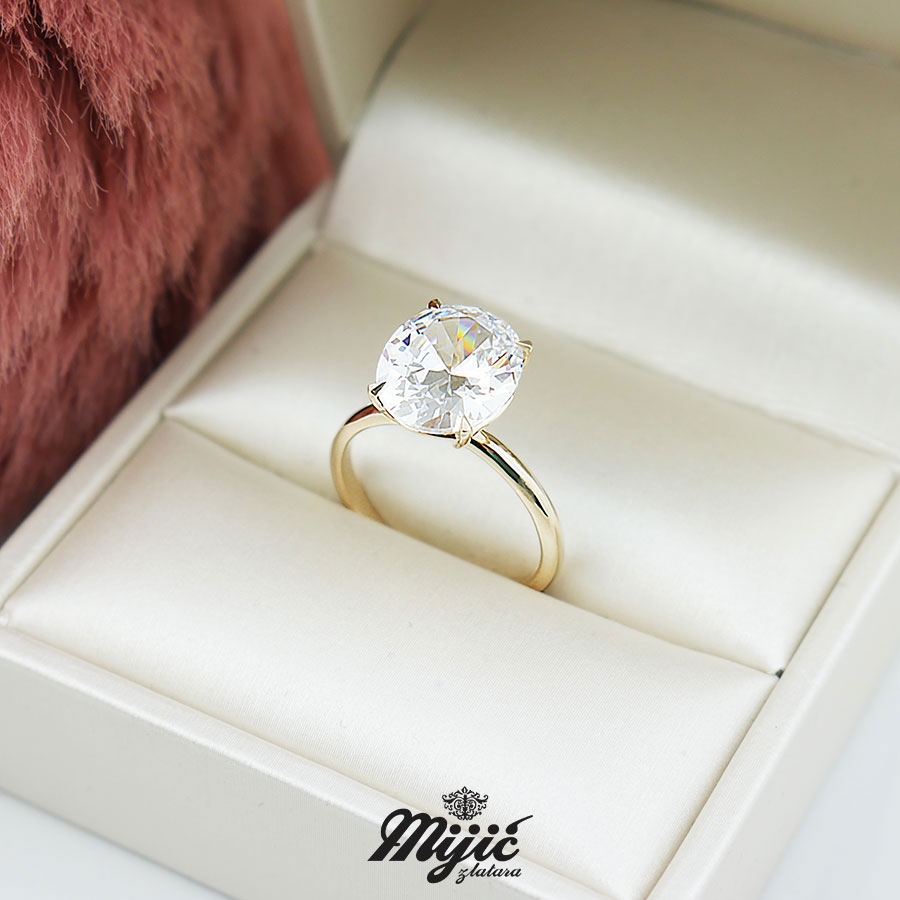 Prsten od žutog zlata sa masivnim centralnim cirkonom. Sav nakit od zlata je finoće 585/1000. Veličina 13 .